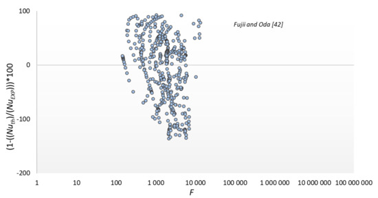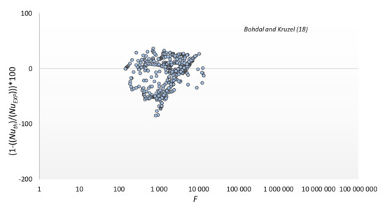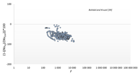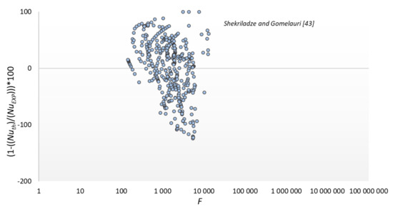 The results of comparing the experimental data with the modeling results according to the relationship of our own and some other authors are shown in Figure 13, Figure 14, Figure 15 and Figure 16. The graphs compare the mean percentage error with F, which is a dimensionless quantity describing the physical properties and thermal-flow parameters of the condensing refrigerants (14).