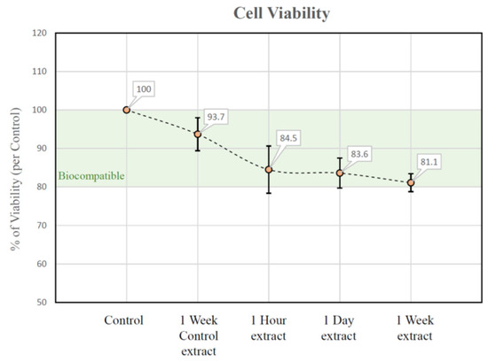 L929 Fibroblasts were seeded into 96-well plates with 1 mL of RPMI medium per well (14,000–16,000 cells per well) and maintained in the culture medium for 24 h. Then, the medium above cells was removed, and 100 uL of extracts from samples were added to each well. Negative control wells consisted of cells cultures without the extracts. After 24 h, the culture medium was replaced with 100 uL MTT for each well, and cells were incubated for four hours at 37 °C in 5%CO2/95% air. The formation of formazan was confirmed under light microscopy. Then, MTT solution was removed, and 100 uL of dimethyl sulfoxide (DMSO) solution was added to each well to solubilize the produced formazan. Cells were incubated for 20 min until all crystals were dissolved. The cell vitality was assessed by measuring the absorbance of cell lysate using a specetophotometer at 540 nm. MTT assays were performed in triplicate.