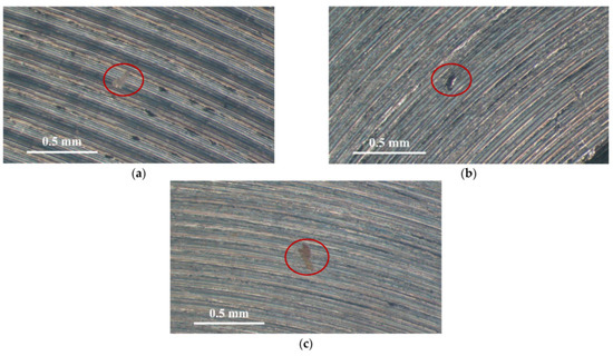 Macrographs of the corrosion regions of those samples with a 0.1 g/m2 chloride concentration at: (a) Relative humidity = 45%, (b) relative humidity = 55%, and (c) relative humidity = 70%.