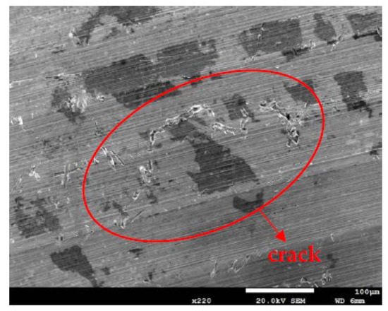 Figure 10 and Figure 11 are SEM micrographs demonstrating the morphology of the SCC of the samples deposited with chloride concentrations of 0.1 g/m2 and 1 g/m2 at various RH levels, respectively. For samples deposited with a 0.1 g/m2 chloride concentration, no SCC cracks were observed on those specimens exposed to the 45% and 55% relative humidities, as shown in Figure 6a,b, whereas Figure 10 demonstrates discontinuous SCC cracks on those specimens tested at a 70% relative humidity. For samples deposited with a 1 g/m2 chloride concentration, no SCC cracks were observed on those specimens exposed to a 45% relative humidity, as exemplified in Figure 8a. Meanwhile, Figure 11a shows discrete SCC cracks on those samples exposed to a 55% RH, whereas Figure 11b reveals continuous SCC cracks on the specimens tested at a 70% relative humidity. Shoji et al. demonstrated that MgCl2 is the sea salt constituent responsible for promoting low-temperature atmospherically induced SCC in AISI 316L and 304L steel. They inspected the phenomenon of atmospherically induced SCC of samples deposited with a 25 g/m2 chloride concentration using sea water [19]. Prosek and coworkers investigated the phenomenon of atmospherically induced SCC of AISI 316L and 304 stainless steel with a 260 g/m2 chloride concentration acquired by MgCl2 droplets [23]. The maximum 1 g/m2 chloride concentration used in this research is much lower compared to that reported in the literature [19,22,23]. Figure 10 and Figure 11a demonstrate short and shallow cracks on those samples deposited with 0.1 g/m2 of chloride at a 70% RH and 1 g/m2 of chloride at a 55% RH, respectively, as opposed to Figure 11b, in which long and deep cracks appear on those specimens deposited with 1 g/m2 of chloride at a relative humidity of 70%. It is conjectured that microcracks nucleate discontinuously at favorable sites in the first place and, under some favorable situations, microcracks grow and then coalesce by means of breaking ligaments between them to connect into one main crack [26,27,28,30]. On the basis of this hypothesis, some of the shallow and short cracks present on those samples with a 0.1 g/m2 chloride concentration at a 70% RH and a 1 g/m2 chloride concentration at a 55% RH could be attributed to finite amounts of Cl– ions transmitted to the crevice sites of the samples. As a result of the low concentration of chloride of the samples tested, it is essential to have higher RH environments to promote the transmission of adequate amounts of Cl to crevice sites for promoting crack nucleation. The Cl maps obtained by EDS mapping are proof of the aforementioned argument. There was no SCC at RH = 45% and 55% whereas specimens exposed at RH = 70%, the highest RH of the three, cracked with those specimens deposited with a chloride concentration of 0.1 g/m2, as shown in Figure 6a,b and Figure 10. This is probably because the chloride concentration of 0.1 g/m2 was so low that it could not initiate stress corrosion cracking in the specimens tested at lower levels of relative humidity (RH = 45% and 55%). Moreover, when the chloride concentration for the specimens was increased to 1 g/m2, there were still no SCC cracks with specimens exposed to RH = 45% whereas those exposed to RH = 55% and 70% cracked, as illustrated in Figure 8a and Figure 11a,b. This can be possibly interpreted as finite chloride transmitted into crevice sites at the lowest relative humidity (relative humidity = 45%) in the specimens deposited with 1 g/m2 of chloride. Therefore, the synergistic effect of the chloride concentration and relative humidity could account for the SCC initiation of the 304L stainless steel. From the experimental results of the work, it can be concluded that the relative humidity threshold for the SCC initiation of AISI 304L stainless steel with an as-machined surface deposited with a chloride concentration of 0.1 g/m2 at 45 °C is between 55% and 70% RH, whereas the relative humidity threshold for those specimens deposited with a chloride concentration of 1 g/m2 is between 45% and 55% RH. The increased volume of corrosion products possibly creates localized stress beneath white emery, which acts like a crevice former, leading to the occurrence of SCC. Furthermore, with the increase in relative humidity, the length of the cracks was observed to increase when comparing Figure 11a to Figure 11b.