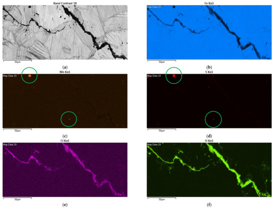 Figure 12 demonstrates EDS mapping for the crack regions of those samples deposited with a 1 g/m2 chloride concentration tested at a 70% RH. The crack region is obviously enriched with chlorine and oxygen, as respectively demonstrated by Figure 12e,f, but depleted with iron, as manifested in Figure 12b. Figure 12c,d reveal enriched manganese and sulfur, respectively, on the center bottom and left top of the figure.