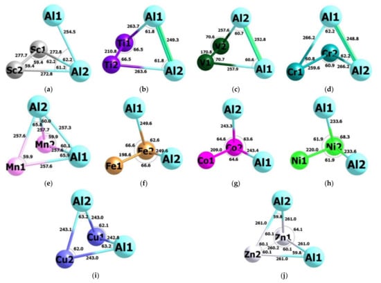 The images of most stable Al2M2 metal clusters: (a)—Al2Sc2 (3-I), (b)—Al2Ti2 (3-I), (c)—Al2V2 (3-I), (d)—Al2Cr2 (1-I)*, (e)—Al2Mn2 (1-I)*, (f)—Al2Fe2 (5-I), (g)—Al2Co2 (5-I), (h)—Al2Ni2 (1-I), (i)—Al2Cu2 (1-I), (j)—Al2Zn2 (1-I)*.