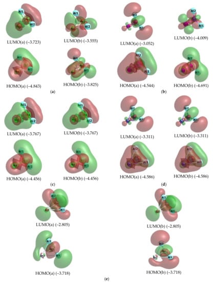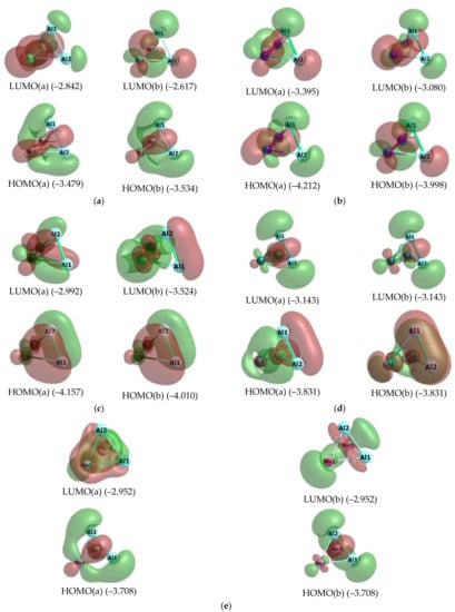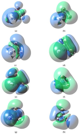 As can be seen from the data in Tables S1–S10, many of the most energetically stable metal clusters, and namely Al2Cr2 (1-I), Al2Mn2 (1-I), Al2Ni2 (1-I), Al2Cu2 (1-I), and Al2Zn2 (1-I), i.e., five out of ten are low-spin and diamagnetic, high-spin are only two of them—Al2Fe2 (5-I) and Al2Co2 (5-I), and the other three occupy an intermediate position between them (Al2Sc2 (3-I), Al2Ti2 (3-I), Al2V2 (3-I)).