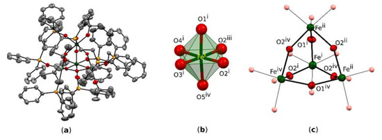(a) The molecular structure of I and the core cation. Displacement ellipsoids are drawn at the 30% probability level; (b) the iron coordinate polyhedron; (c) view of the adamantane-like geometry exhibited by the [Fe4O6] core in I; symmetry codes: (i) x, y, z; (ii) x, 1−y, ½ −z;(iii) 1 ¼−x, ¾−y, ¼ +z; (iv) 1 ¼−x, −¼ +y, ¾−z; hydrogen atoms are omitted for clarity.