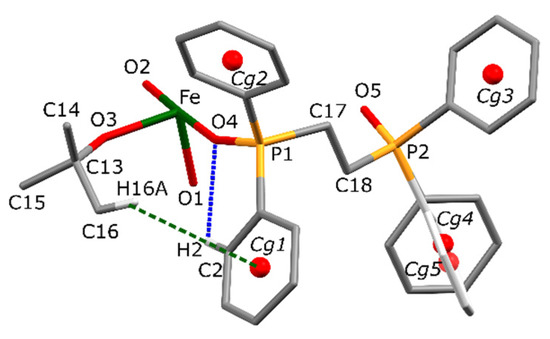 A similar FP analysis for O…H contacts of the O2 atom demonstrates significant differences and contributions of particular contacts to the HS are different than those observed for the O1 atom. Thus, with increasing contributions from the O…Fe contacts (18.0%), diminishing contributions of the scattered spots from the O…H interactions (76.8)% are observed. Moreover, a decomposition of the FP for O2 into individual contacts revealed the presence of O…O contacts at the level of 1.6%, which are absent for O1. This long-range (di ≈ 1.2–1.4 Å and de ≈ 1.6–1.8 Å) intramolecular O…O contact follows the formation of a homonuclear intramolecular interaction between the O2 and the oxygen atom of the phosphoryl group, O4. The analysis revealed subtle differences between the two bridging oxygen atoms, O1 and O2. Although geometries characterizing the O-Fe bonds are comparable for O1 and O2, the contributions of the respective contacts to their HS differ significantly. Interestingly, the analysis revealed that the O1 atom forming the adamantane-like core is more hindered by hydrophobic groups, such as the CH3 fragment of the t-BuOH ligand and the CH groups of the phenyl rings, while O2 is more exposed and capable of formation of other contacts. Such distinctions of seemingly equivalent cage-internal atoms are not so striking in the case of classical structural analysis based on geometrical parameters alone. These differences can be reveled and understood only with the HS analysis.