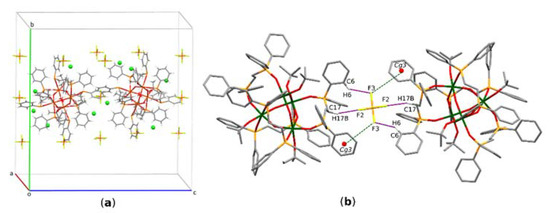 In the crystal, each cation of complex I is surrounded by PF6− and Cl− ions (Figure 3a). The structure is stabilized by an extensive network of C-H…π interactions of the linking phenyl rings of the neighboring molecules. However, the crystal packing results mostly from the electrostatically driven C-H…F and F…π interactions [20] between the phenyl rings of the ligand L and fluorine atoms of the PF6− anion. Thus, each PF6− anion links two neighboring complexes (Figure 3b). The geometrical parameters characterizing these interactions are presented in Table 3. The H…F distance of 2.46(1) Å, defining the C17-H17B…F2 hydrogen bond, is shorter than the mean H…F distance of 2.53 Å reported for the C-H…F (PF6−) interactions, while the C6-H6…F3 distance is longer than the mean value. Similarly, the respective D-H…A angle values indicate that the C17-H17B…F2 hydrogen bond (145˚) is stronger than that in C6-H6…F3 (124˚). The former value is close to the mean angle of 143° reported in the literature for such interactions [21]. The F…π interaction between the PF6− moiety and the phenyl ring Cg3 is defined by two values, i.e., the distance between fluorine atom and the centroid of the ring (4.057 Å), and the distance between fluorine atom and the respective atom-to-plane distance (3.165 Å). These values are also within the mean values reported in the literature for similar interactions.