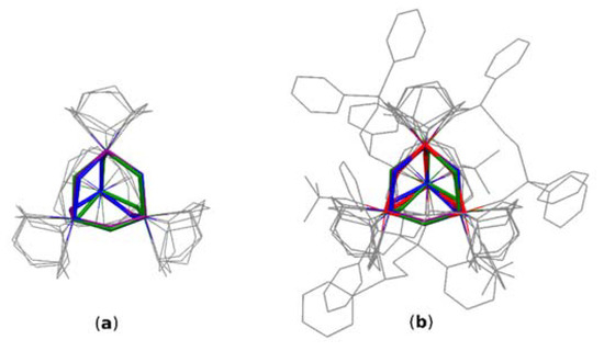 Types of bridging oxygen atoms can be distinguished through a comparison of their respective bonding characteristics [26]. According to the International Tables for Crystallography, a typical mean bond length for Fe-Ooxo is 1.794 Å, while the mean Fe-O bond length in the reported structure is 1.961 Å and is consistent with the typical value reported for the Fe-OOH distance (1.967 Å). A comparison of the cage parameters of structurally similar systems (Table 4) confirmed the hydroxy character of the bridging oxygen atom in I. Due to various symmetries governing the cage geometry of selected structures, one parameter may be defined by more than a single value. Therefore, for comparison purposes relevant mean values and their ranges (min/max) have been used (Table 4). A comparison of Fe-O bond lengths of similar systems confirmed that bridging oxygen atoms in I are hydroxy bridges. For example, the average Fe-O bond for the studied structure is 1.961 Å and is within the range of 1.939–2.033 Å reported for related structures. This value is significantly larger than the respective Fe-Ooxo bond lengths of 1.804–1.826 Å previously reported for similar cages. Similarly, the Fe…Fe distances for the iron atoms bridged by hydroxy ligand (FeOH-FeOH) are longer than the corresponding oxo-mediated Fe…Fe distances (FeO…FeO). The mean value of 3.744 Å obtained for I is even longer than relevant hydroxo mediated Fe…Fe distances in structures containing mixed oxo/hydroxo bridges. The studied structure I is characterized by a significantly larger Fe-OOH-Fe angle than the analogus angles observed in the reference structures. At the same time, the relevant OOH-Fe-OOH angle is lower than that reported for the hydroxy bridged fragments of similar structures. These geometrical differences may arise from the fact that the structure with pure hydroxo bridges is not affected by the delocalization of electrons of oxo bridges observed in mixed oxo-hydroxo bridged structures. The delocalization cause elongation of the respective Fe-Ooxo bond with simultaneous shortening of the Fe-OOH bonds. The overlay of [Fe4O6] cores of compared structures is shown on the Figure 5b.