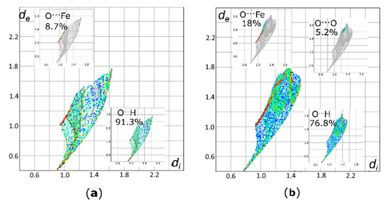 The bridging O-atoms in the [Fe4O6] adamantane-like framework of I consist of six [µ-OH]– units. These units are defined by four O1 and two O2 atoms which are symmetrically independent. The O2 atoms are placed ideally on the 4-fold rotonversion axis. At first sight, both oxygen atoms do not differ from each other and form Fe-O bonds characterized by similar parameters. However, fingerprint plots (FP) generated for Hirshfeld surfaces (HS) of symmetrically independent oxygen atoms O1 and O2 revealed differences in their intramolecular environments (Figure 6). The HS of O1 is defined by only two types of intramolecular contacts, O…Fe and O…H. Contacts with the metal centers, O…Fe (8.7%), are represented mainly by green and red dots extending at scattergrams from about de = 1 Å to de = 1.4 Å and di = 0.9 Å to di =1.2 Å. Spots representing contacts with hydrogen atoms, O…H (91.3%), are more spread. The shortest contact, visible as the second spike and starting from the values of di = 0.9 Å and de = 0.5 Å, represent the hydrogen atom forming a bond with the O1 oxygen atom. Other scattered spots above these values reflect a contribution of the O…H contacts with hydrogen atoms from one CH3 group of the t-BuOH ligand and the phenyl rings surrounding the core.