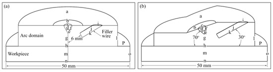 The details of boundary conditions applied to the arc and torch domains are shown in Table 2. Furthermore, Table 3 and Table 4 shows the details of boundary conditions applied to the filler wire and workpiece domains. Boundaries a–p shown in Figure 1 are explained in Table 2. In addition to this, Table 3 and Table 4 represent the boundary surfaces shown in Figure 1.