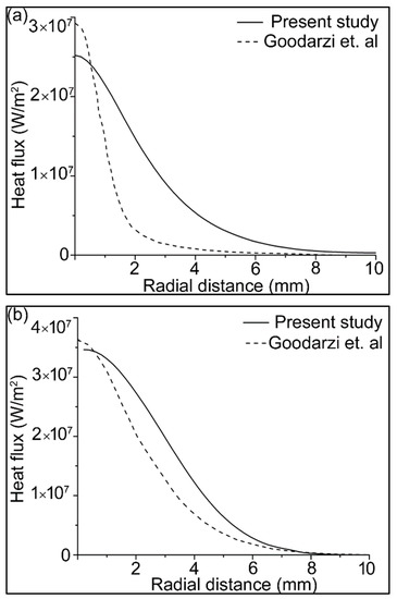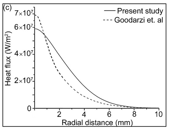 Heat transfers to the workpiece because of the convective and electron heat fluxes, according to Equation (21). These heat fluxes are important for predicting an accurate weld pool. The heat fluxes were validated with the results of Goodarzi et al. [58], as shown in Figure 3. These results are in the absence of the filler wire, with the following welding parameters: current 200 A, arc length 5 mm, tip angle 60°.