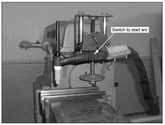 The weld pool shape was determined numerically and experimentally after 2 s without the filler wire. In the experiments, the arc was DCEN (direct current electrode negative), and the welding current was 200 A. The shielding gas was argon, with a 14 L/min flow rate. The electrode was thoriated tungsten, 3.2 mm in diameter. The tip angle was 60°, and the arc length was 5 mm. The workpiece material was SS304, 50 mm in diameter and 10 mm thick. A Miller XMT 456 CC/CV multipurpose welding machine was used for the experiments. The switch in the welding torch shown in Figure 4 is connected to the timer, which ignites the arc after pressing. The timer switches off the arc automatically after two seconds. The numerical and experimental weld pool shapes shown in Figure 5 show good agreement and, therefore, validate the simulation model. The same simulation model was used to study the behavior of the arc and the weld pool transiently, with the addition of filler wire.