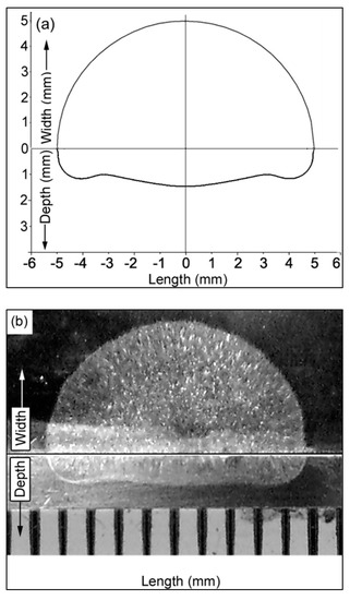 There is a slight difference in the results, because the authors of [58] assumed laminar arc flow, while the arc flow considered in this study was turbulent. However, the results were found to be consistent with the experimental weld pool shapes.