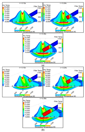 Temperature distribution in the arc, filler wire, and workpiece: (a) 90° torch; (b) 70° torch.