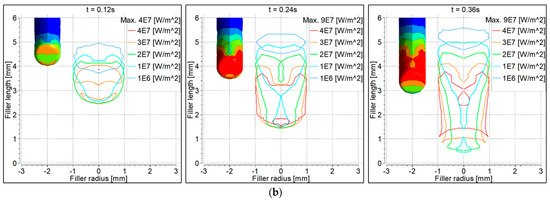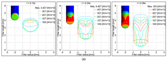 Figure 10 shows heat flux to the workpiece surface due to the electron contribution. The filler wire is shown as shaded. Heat flux distribution behavior was the same as discussed for the convective heat flux. Since the heat was taken by the filler wire, it was therefore contracted on the workpiece surface underneath the filler wire.