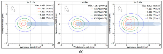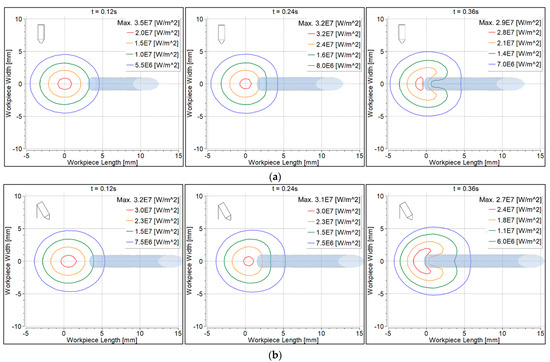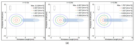 Convective heat flux to the workpiece surface is shown in Figure 9. At 0.12 s, the heat flux was symmetrical with the 90° torch, becoming non-symmetrical at 0.24 s and 0.36 s (Figure 9a). The heat flux was non-symmetrical with the 70° torch at all time intervals (Figure 9b). Heat flux beneath the filler wire was contracted at 0.36 s because some heat was taken by the filler wire.