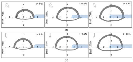 The weld pool depth is presented in Figure 11 in more detail. The gray portion represents the mushy zone. The internal and external temperatures were 1750 °K and 1550 °K, respectively. The feeding filler wire is shown in blue, looking from the top of the workpiece. The development of the weld pool is shown transiently at three intervals. The width changed from nearly 4.2 mm (at 0.12 s) to 7 mm (at 0.36 s) with both the 90° and 70° torches. The width was observed to be symmetrical with the 90° torch, as shown in Figure 11a. The pool width was non-symmetrical with the 70° torch, and was away from the arc center in the direction of the torch, as shown in Figure 11b. Similar behavior was observed in [30], without the addition of filler wire.