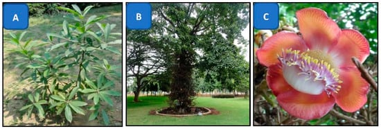 - Rane, J.B.; Vahanwala, S.J.; Golatkar, S.G.; Ambaye, R.Y.; Khadse, B.G. Chemical Examination of the Flowers of Couroupita guianensis Aubl. Indian J. Pharm. Sci. 2001, 63, 72–73. [Google Scholar]