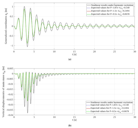 The comparison of the results obtained by non-linear solution under harmonic excitation and by an equivalent linearization technique conducted for Gaussian white noise excitation is presented in Figure 3. The total time that is needed for the lift car to travel from the top of the building to the base floor level at the transport speed specified above is about 82 s. However, for the clarity of the presentation, some diagrams presented in Figure 3, Figure 4, Figure 5, Figure 6 and Figure 7 show the selected parts of the motion. In Figure 3 it can be seen that the expected values of the generalized coordinates and vertical displacements of the main mass are the same for every case of values P and that were taken into consideration during the analysis. Additionally, the expected values obtained from the equivalent linearization technique are comparable with the deterministic results received under harmonic excitation. The diagrams of the variances for the particular random state variables presented in Figure 4 show that the lower the value of the damping is taken into the analysis the higher value of the variance is obtained, which seems to be obvious. Some deviations from this rule can be noticed in the initial phase of the motion.