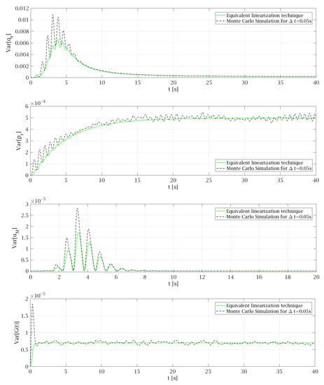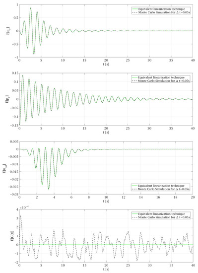 In the Monte Carlo simulation conducted in this work, the standard deviation of the Gaussian white noise process is assumed according to Equation (73) with the value . This leads to the variances that are comparable for every time step . During the analysis, the Monte Carlo simulation was made for different values of P and and the behavior of the system is similar in each case. Therefore, in this article only results for P = 1.87 × 10−4 m2/s3 and that are presented in Figure 5, Figure 6 and Figure 7 are discussed. Figure 5 shows that the expected values of particular random state variables are almost the same in both methods. The only differences can be seen in case of where in equivalent linearization technique a solid line with the value 0 is observed while in the case of the Monte Carlo simulation, the results oscillate around zero, because they depend on the Gaussian white noise process, which is generated as a sequence of random variables. From Equations (42) and (43) governing the process it follows that the exact mean value . Since these equations are just appended to the dynamic system and are linear, the equivalent linearization technique yields exact mean value.