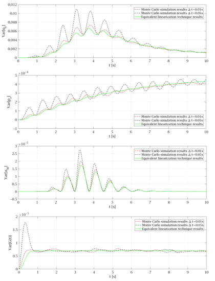 Figure 5, Figure 6 and Figure 7 present good matches between the diagrams obtained by Monte Carlo simulation and equivalent linearization technique, which show that the proposed linearized model is adequate. It leads to the conclusion that the equivalent linearization technique can be successfully used to obtain the mean values and variances of particular random state variables. The most important advantage of this solution is the much lower time needed to obtain results. For example, for small time steps like s, the total time to conduct the Monte Carlo simulation is several hundred times longer in comparison to the equivalent linearization technique. The application of the proposed method in the computer codes leads to a procedure that can be easy adapted to objects with different parameters.