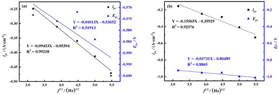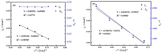The solution shows that n = 1.8, which is approximately equal to 2. Therefore, the number of electrons transferred in the electrochemical reduction reaction corresponding to peak B should be 2. In summary, Ni3+ reduction is divided into two steps, namely Ni3+ + e− = Ni2+, Ni2+ + 2e− = Ni. The ipc-Epc-v1/2 curves of peaks A and B were respectively drawn according to Figure 10, as shown in Figure 12. It can be seen from the figure that the ipc and v1/2 of the two have a linear relationship. It can be judged that the reduction in Ni3+ to Ni2+ is controlled by the electron transfer step, and the reduction in Ni2+ to Ni is controlled by the electron transfer step and the diffusion process.