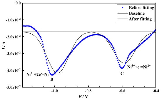 Peak B was fitted according to the square wave voltammetry, as shown in Figure 6. The half-width of peak B is W1/2 = 0.15, and the number of electrons transferred from peak B is n = 2.06, calculated from Formula (1), which is about equal to n = 2, and the number of electrons transferred from peak C is judged to be 1. Therefore, the reaction of Ni3+ on the Mo electrode is shown in Equations (2) and (3):