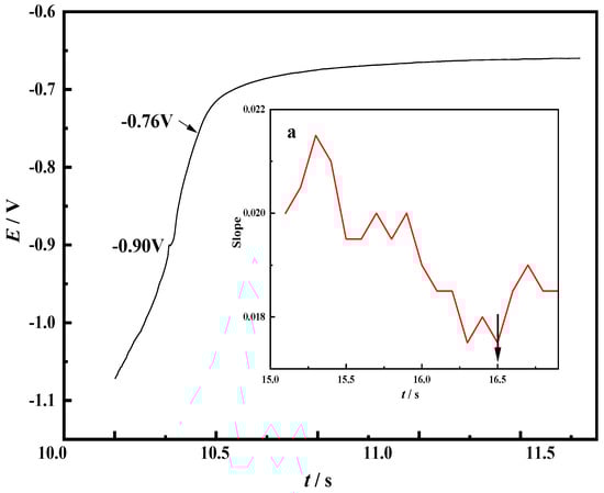 According to the chronocurrent curve shown in Figure 7, the potential corresponding to the two-step oxidation process of nickel can be roughly judged. In the chronopotential curve shown in Figure 8, the plateau corresponding to −0.9 V is more obvious. For differentiation, consider part of the data in the figure. The result is shown in Figure 8a. When t = 16.5, the slope is the smallest, indicating that the curve has reached the smoothest stage, and the corresponding potential is −0.76 V. This process is consistent with the appearance mechanism of peak A in the cyclic voltammetry curve. The plateau near −0.90 V exists for a short time, indicating that as the potential increases negatively, the reduction rate increases, and the Ni2+ concentration in the molten salt decreases with the rapid progress of the reaction. This process is consistent with the appearance mechanism of peak B in the cyclic voltammetry curve. According to the above analysis, in the NaCl-CaCl2-LiNiO2 molten salt system, the electrochemical reduction process of Ni2+ on the Mo electrode is Ni3+ → Ni2+ → Ni.