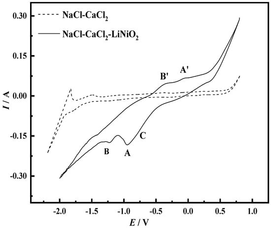 Figure 1 shows the cyclic voltammetry test results of NaCl-CaCl2 molten salt and NaCl-CaCl2-LiNiO2 molten salt when the scanning speed is 0.25 V/s. The dotted line in the figure is the cyclic voltammetry curve of NaCl-CaCl2 molten salt. It can be seen that there are only the reduction peaks of Ca2+ and Na+ and the oxidation peaks of Ca and Na, indicating that the NaCl-CaCl2 molten salt system is between −1.68 V and 0.37 V. No oxidation–reduction reaction occurs, and this range can be used as the scanning range after adding LiNiO2 to the NaCl-CaCl2 molten salt.