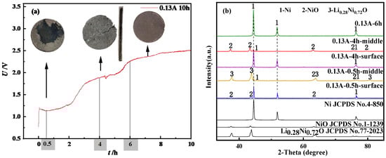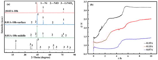 In addition, the presence of NiO also proves again that there is a two-step electrochemical reduction behavior of Ni3+ in LiNiO2. When the current is greater than or equal to 0.03 A, the products after 10 h are all Ni elemental. It can be seen that under the same deoxygenation time condition, a larger current can promote the reduction reaction, so that NiO can continue to be reduced to a Ni elementary substance. It can be seen that under the same deoxygenation time condition, a larger current can promote the reduction reaction, so that NiO can continue to be reduced to a Ni elementary substance. It can be seen from Figure 14b that different currents cause differences in the degree of electron accumulation at the electrodes, resulting in different starting positions of the curve. In addition, comparing the time range corresponding to each reaction platform on the three curves in the figure, the first platform in the U-t curve measured under the condition of 0.07 A current corresponds to about 4 h, while the second platform corresponds to the duration of “shorter”. The above phenomenon shows that in the first electrochemical reduction process, more NiO and a small amount of Ni element are mainly formed. Therefore, in the second reduction process, the Ni elementary substance is formed faster. The current condition of 0.15 A promotes the progress of electrochemical reduction, so that the reduction reaction is concentrated in the second step of the reaction process. Under the condition of 0.13 A, the whole reaction process is relatively stable, and there is a good transition time. Under the conditions of an electrolysis time of 10 h and currents of 0.07 A, 0.13 A and 0.15 A, this study calculates the actual charge and the theoretical charge according to Equations (8) and (9), and finally calculates the current efficiency of the three, as shown in the Table 1 shown.