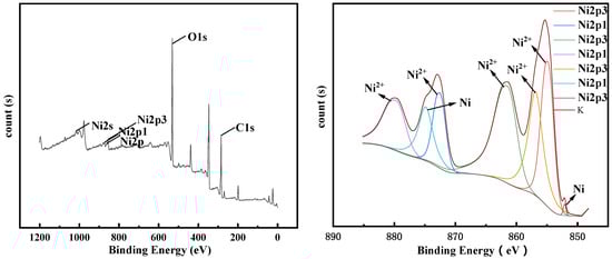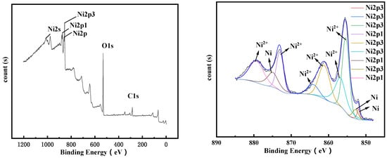 XPS detection was performed on the electrolysis products after 4 h and 10 h, and the results are shown in Figure 18 and Figure 19, respectively. It can be seen from the XPS spectrum that elemental nickel appears in the product of electrolysis at 4 h. As the electrolysis time increases, more Ni2+ is reduced to elemental Ni, and the peaks corresponding to elemental Ni in the XPS spectrum increase. Compared with the XPS spectrum after 4 h of electrolysis, the 2p peak of Ni after 10 h of electrolysis is weaker and wider, while the 2p peak of part of Ni2+ is strengthened. This phenomenon is caused by the increase in oxides on the surface of the sample [26].