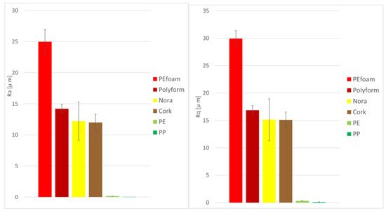 Roughness Ra and Rq of six material surfaces: PEfoam, Polyform, Nora, cork, PE and PP.