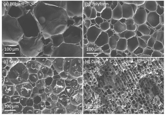 Field-emission scanning electron microscopy (FE-SEM) micrographs of cellular structure of foamed samples: (a) PEfoam, (b) Polyform, (c) Nora and (d) cork.