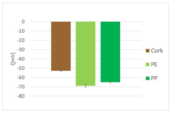 Zeta potentials of three different material surfaces: cork, PE and PP.