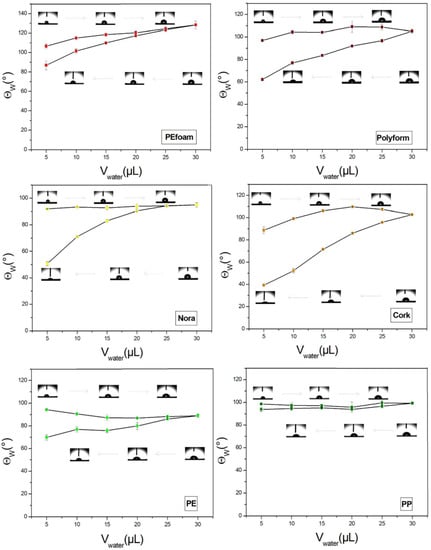Contact angles of water droplet on six different materials: PEfoam, Polyform, Nora, cork, PE and PP. Advancing (upper curves) and receding (lower curves) contact angles are shown. Insets show liquid droplets on the material surfaces.