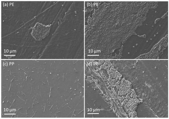 FE-SEM micrographs of the surface of solid polymer samples; bacterial adhesion on (a) PE–smooth surface, (b) PE–damaged surface, (c) PP-smooth surface and (d) PP–damaged surface.