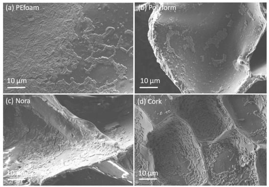 FE-SEM micrographs of the surface of foamed polymer samples; bacterial adhesion on (a) PEfoam, (b) Polyform, (c) Nora and (d) cork.