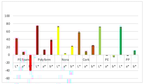 As seen from Figure 7 orthotic materials PEfoam, Polyform, Nora, cork, PE and PP. PE and PP exhibit similar L* values and consequently share similar lightness. Cork has lower L* value and PEfoam the lowest which ranks both as significantly darker. Polyform has the highest a* value, followed by cork and PEfoam. PE and PP exhibit slightly negative a* values that results in a more green color as compared to redish color of other samples. The highest b* value (yellow appearance) was recorded for cork, followed by Nora and PP, negative values (bluish appearance) were recorded for PE and PEfoam that had the lowest value at −39.8. In general, Polyform was among the lightest and the yellowish while PP was among the lightest and the greenish. On the other side, PEfoam was among the darkest and the bluish.