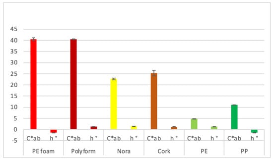 Chroma C*ab values and hue angle (h°) as calculated from results of [37] are presented in Table 4. Comparing C*ab values and hue angle (h°) to basic L*, a* and b* parameter, we notice quite narrow ranges for both parameters. C*ab ranges from 14 to 22 and h° from 0.92 to 1.32. PEfoam and Polyform have higher values (40) meaning more different from grey color. Nora and cork C*ab values resemble tan and brown skin while polyethylene and polypropylene have both lower values as common skin types. Hue angle values of Polyform, cork and polyethylene matches that of common skin [37]. Polypropylene and PEfoam have slightly negative values but nevertheless all hue angle values correspond to red color.