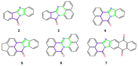 The functional group of perinone derivatives is composed of two conjugated heterocyclic rings containing nitrogen atoms, marked in purple and green. The sizes of these rings are different since they can be five- or six-membered, hence we have four combinations: in molecule 2 (pyrrolo-2-one and imidazole), molecule 3 (pyrrolo-2-one and pyrimidine), six- and five-membered rings in molecules 4, 5, and 7 (pyridin-2-one and imidazole), and two six-membered rings in molecule 6 (pyridin-2-one and pyrimidine). All structures are flat, hence the perinone derivatives tend to form π-stacks.