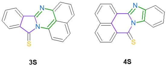 Synthesis of thioxoderivatives of perinone 3S and 4S can be realized by condensing trithioanhydrides and appropriate diamines at relatively high yields. Direct sulfuration of the corresponding molecules (3, 4) did not lead to the intended products in a synthetically useful yield [40,41].