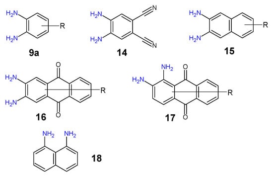 Asymmetrical perinone derivatives of 13 were obtained by the reaction shown in Figure 6, mainly by changing aromatic diamines. The most commonly used diamines are shown in Figure 7 [44,45].