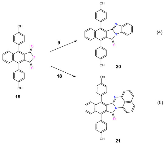 Meng et al. [47] synthetized two bisphenols containing a benzoylene-benzimidazole moiety, 20, and a phthaloperinone moiety, 21, from the anhydride 19 by reaction with aromatic diamines as shown in Figure 8.