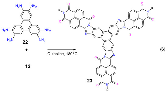 Another way to obtain C3-symmetric disk-shaped molecules was presented by Hanifi et al. [53]. They attempt to synthesize this type of molecule by using a hexaaminobenzene (24) in condensation reaction. The synthesis reaction is shown in Figure 10.