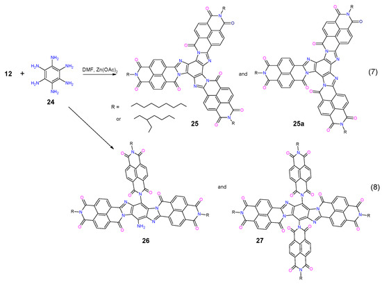 Due to the insolubility of 1 and 1a in typical solvents, it is also possible to obtain an unsymmetrically annulated imidazo cycle, in which bulky alkyl substituents in the imide part of molecule provide solubility. Such molecules can be obtained by the reaction of aromatic monoimides with o-phenylene diamine or its derivatives, as shown in Figure 6 [43,44].