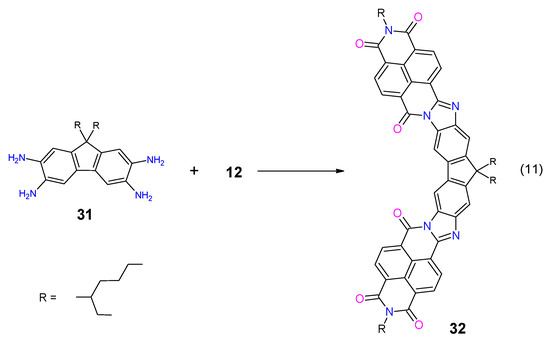 Another way to increase the solubility of perinone derivatives was to use aromatic diamines or tetraamines substituted with long or branched alkyl chains. Li et al. [56] applied 2,3,6,7-tetraamino-9,9-bis(2-ethyl-hexyl)fluoren (31) in condensation reaction with 12 for synthesis of symmetrical bisperinone derivatives (32), as shown in Figure 12.