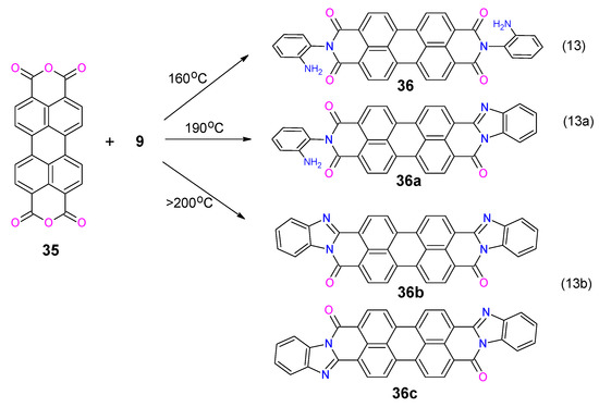 At lower condensation temperature (160 °C), the main product (67.1%) was N, N′-di (o-amino) phenyl-perylenetetra-carboxyl-diimide with 2 amine groups free (36) (reaction13), which is soluble in alkaline hydrosulfite and insoluble in 90% sulfuric acid. The color of solution was dull-red violet of low value as a vat dye. At moderate condensation temperature (190 °C), a 3,4-benzimidazole-9,10-(o-amino)phenyl-perylenetetracarboxyl-diimide (37) with one free amine group was obtained with a yield (60.6%). This nonsymmetric derivative of perinone 36a was easily soluble in alkaline hydrosulfite and also in 90% sulfuric acid giving a solution having a deep violet shade with a strong dyeing power. At temperatures higher than 200 °C, the main product was 3,4,9,10-perylenetetracarboxyl-bis-benzimidazole (36c), a symmetric perinone, which was a violet blue substance insoluble in alkaline hydrosulfite and in common solvents. The diamino compound (36) could be converted mainly into (36a) by boiling with nitrobenzene for 1~1.5 h and it almost entirely changed into the perinones (36b, 336c) when boiled with nitrobenzene for 5 h [58]. The insolubility of the molecule has proved to be an obstacle to its wider use, and in the dye industry, but long-wave absorption properties can be used to produce IR absorbing pigment [59].