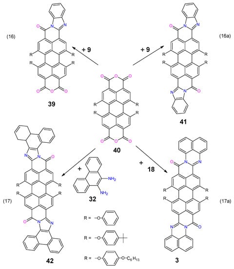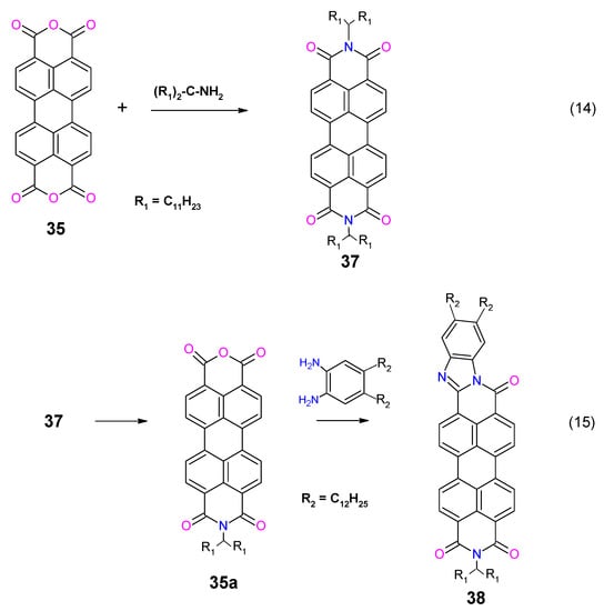 Wicklein et al. [60] described the synthesis of an asymmetric perylene imide benzimidazole using 35 and 1,2-diamino-5,6-dialkybenzene, as shown in Figure 15.