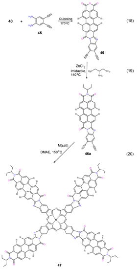 Using 40 with the tert-butylphenoxy group as R-substituents on perylene core, Schönamsgruber et al. [65] synthesized a soluble perylene–phthalocyanine hybrid 47. The synthesis was a multistep process presented in Figure 17.