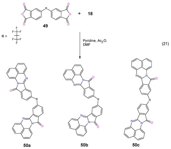 Kobrakovet et al. [46] showed another way to synthesize unsymmetrical perinone derivatives by direct reaction of ortho or peri-tetracarboxylic acids, or the corresponding dianhydrides, with aromatic ortho- or peri-diamines. In the first step, only one imidazole ring is formed whereas the second anhydride group is preserved in the structure of the dye for further chemical modification of the molecule to obtain an assortment of dyes with a new set of properties. Using this method they synthesized 28 thermostable different dyes with a wide range of colors, from light yellow through purple to dark blue.