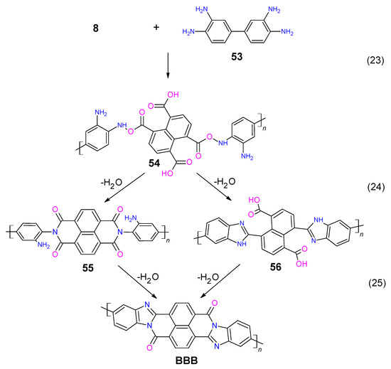 Research into model compound reactions showed, that condensation between aromatic dianhydrides 8 and tetra-amines 53 proceeds in three successive stages: formation of an amide-amino-acid, cyclisation of the latter to an aminoimide, and finally conversion of this product into an aroylenebenzimidazole polymer BBB [78,79,80]. The proposed mechanism of polycondensation is shown in Figure 22.